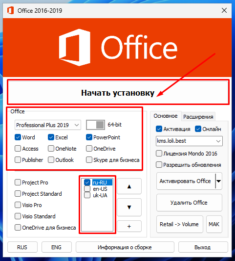 - Выбираем нужные приложения и локализацию в установщике и нажимаем "Начать установку";